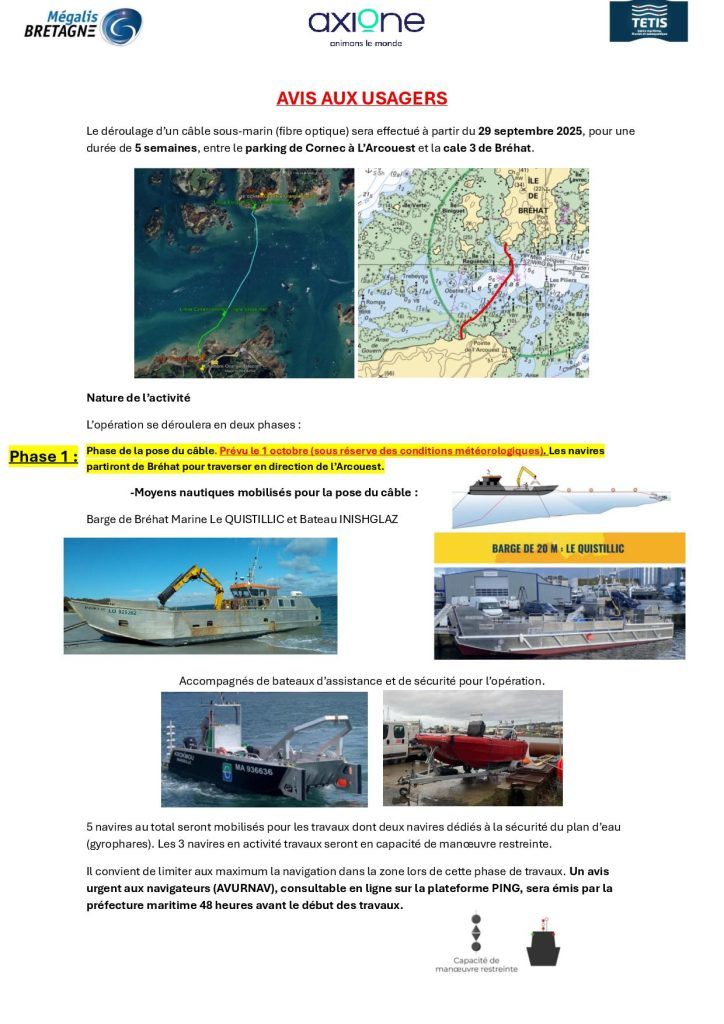 Le déroulage d’un câble sous-marin (fibre optique) sera effectué à partir du 29 septembre 2025, pour une durée de 5 semaines, entre le parking de Cornec à L’Arcouest et la cale 3 de Bréhat.