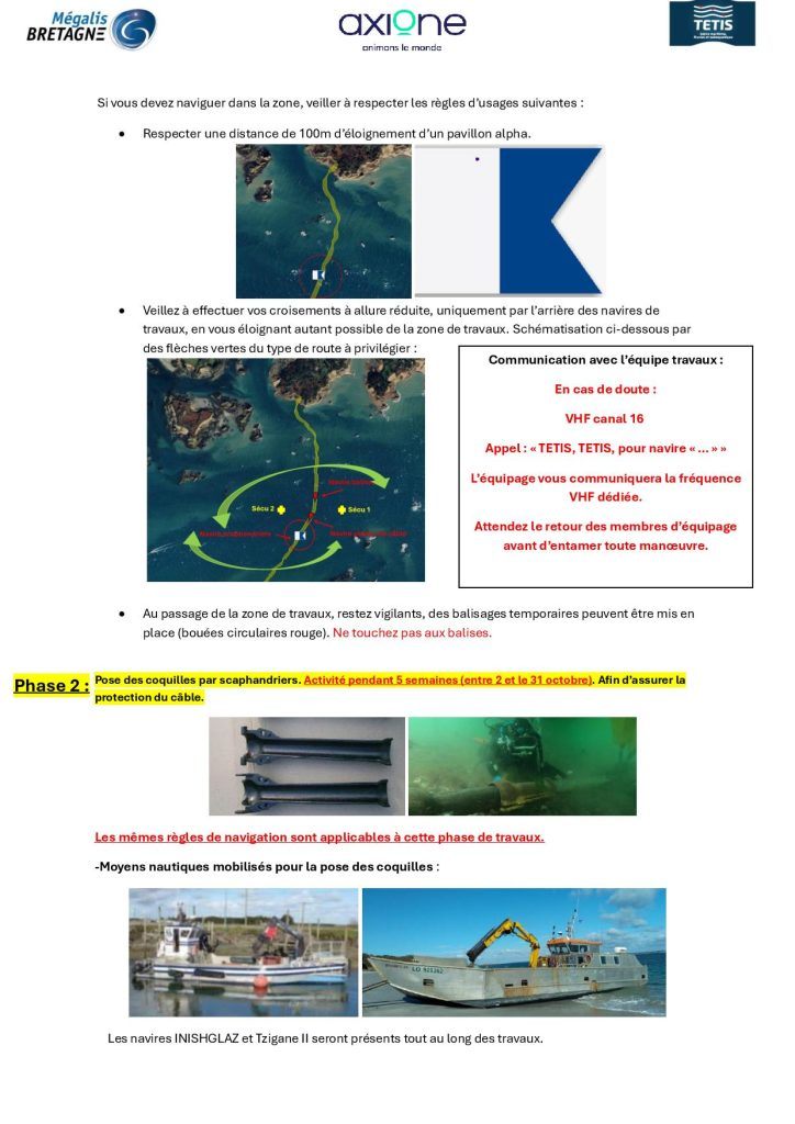 Il convient de limiter aux maximum la navigation dans la zone lors de cette phase de travaux. Un avis urgent aux navigateurs (AVURNAV), consultable en ligne sur la plateforme PING, sera émis par la préfecture maritime 48 heures avant le début des travaux.